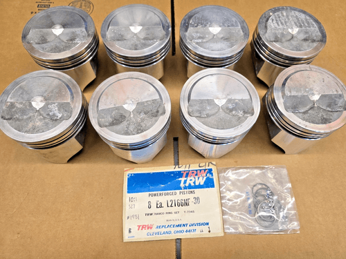 Item #60 L2166N+30 TRW 327 Forged pistons NOS (SET OF 8) 10:1 CHEVROLET V8 NHRA